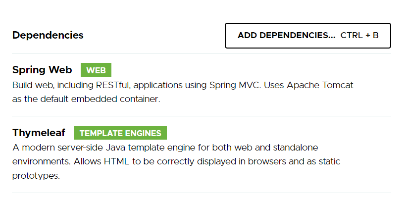 오른쪽 ADD 버튼을 누르고 Spring Web과 Thymeleaf를 겁색창에 입력하여 클릭하여 선택해주었습니다.