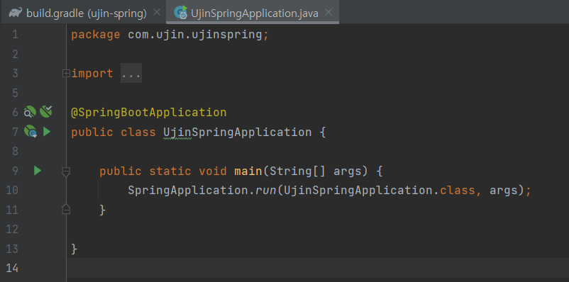 SpringApplication.run해서 UjinSpringApplication Class 넣어주면 @SpringBootApplication이 실행됩니다.