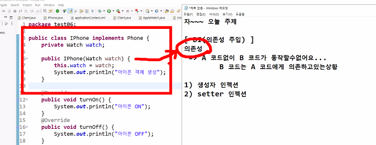 생성자 주입 : 워치가 없으면 아이폰을 생성할 수 없음. 워치없이 아이폰 생성 안됨
