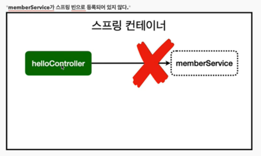 @Autowired를 통한 DI는 helloConroller. MemberService 등과 같이 스프링이 관리하는 객체에서만 동작한다. 스프링 빈으로 등록하지 않고 내가 직접 생성한 객체는 동작하지 않는다
