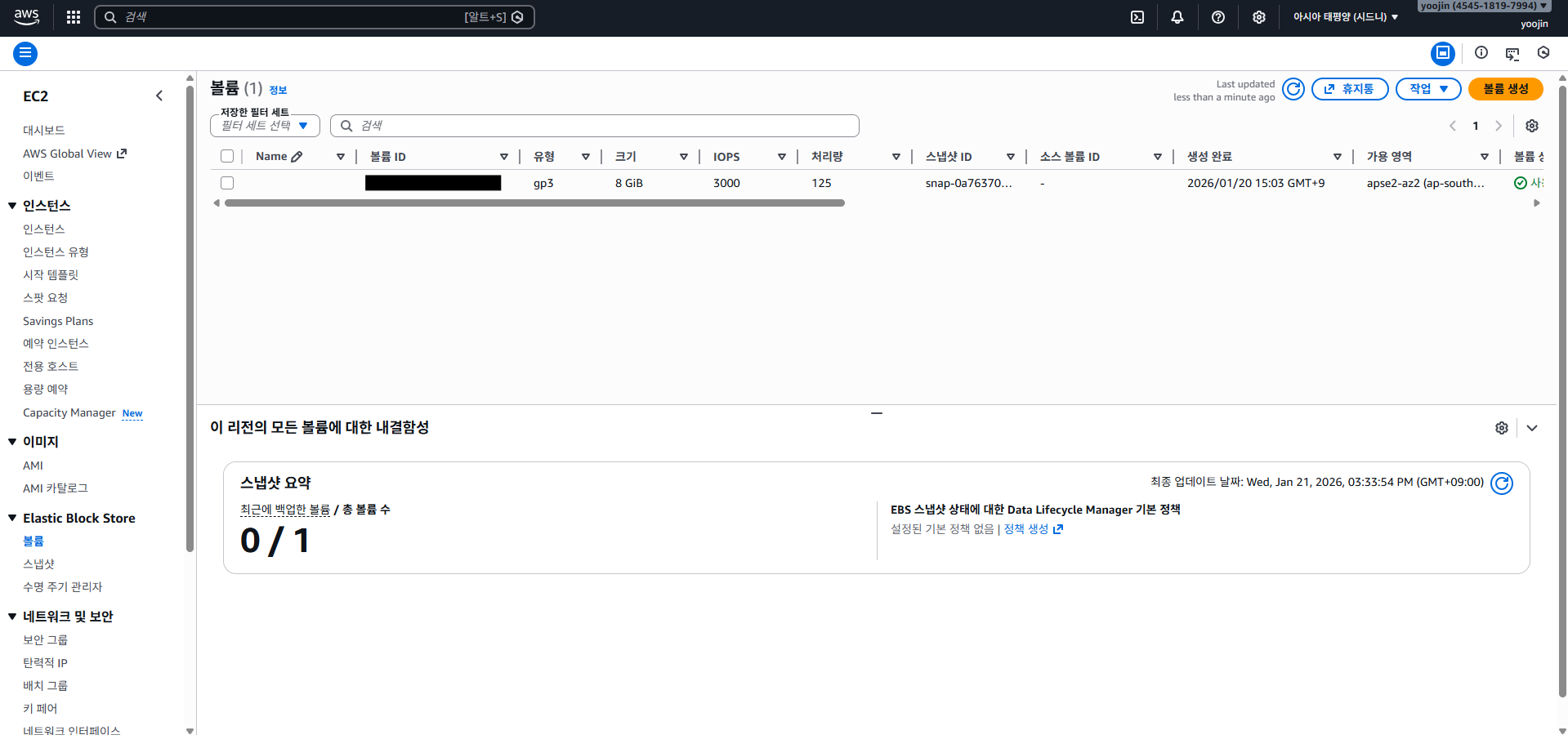 AWS 콘솔 → EC2 → 왼쪽 메뉴 Volumes(볼륨)