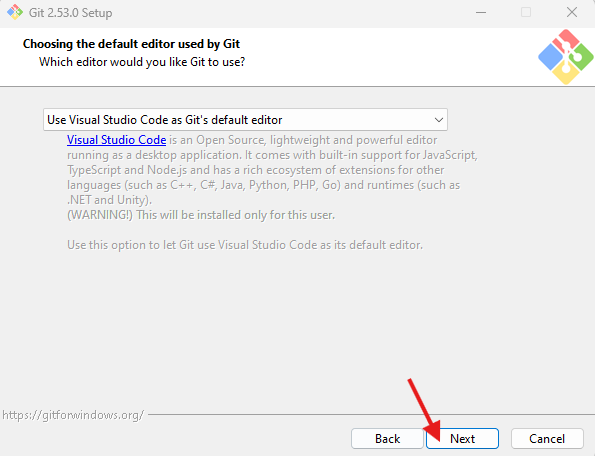 드롭다운을 해서 Use Visual Studio Code as Git's default editor 선택 → Next