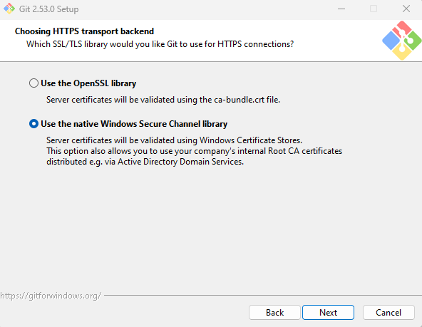 Git이 HTTPS로 서버(GitHub 같은 데)랑 통신할 때 보안 인증서 어디 걸 쓸지 고르는 것