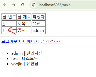 여기에서 admin이 작성한 글 1번을 눌렀을 때의 흐름을 정리해보도록 하겠습니다