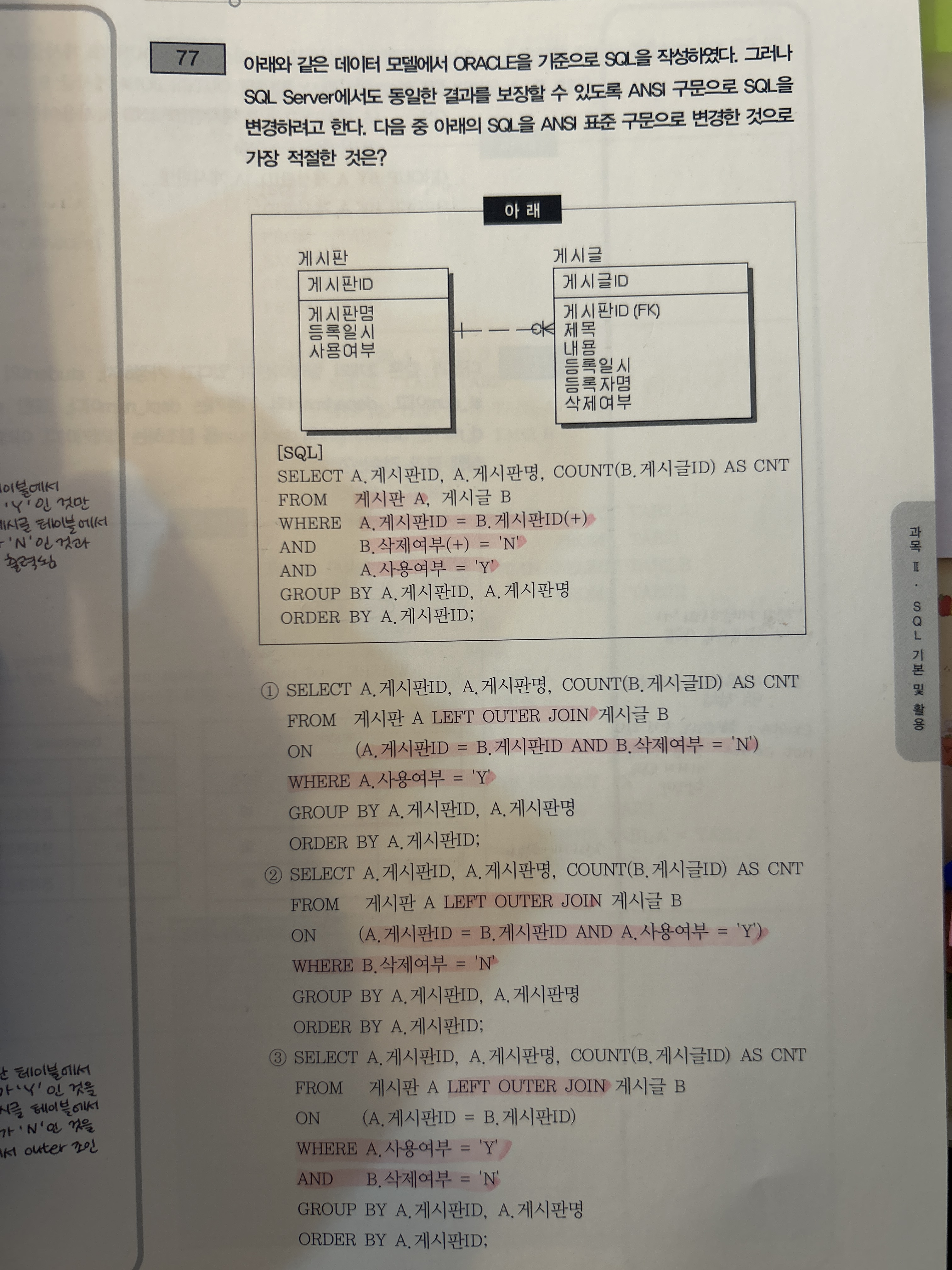 다음중 아래의 SQL을 ANSI 표준 구문으로 변경한 것으로 가장 적절한 것은?