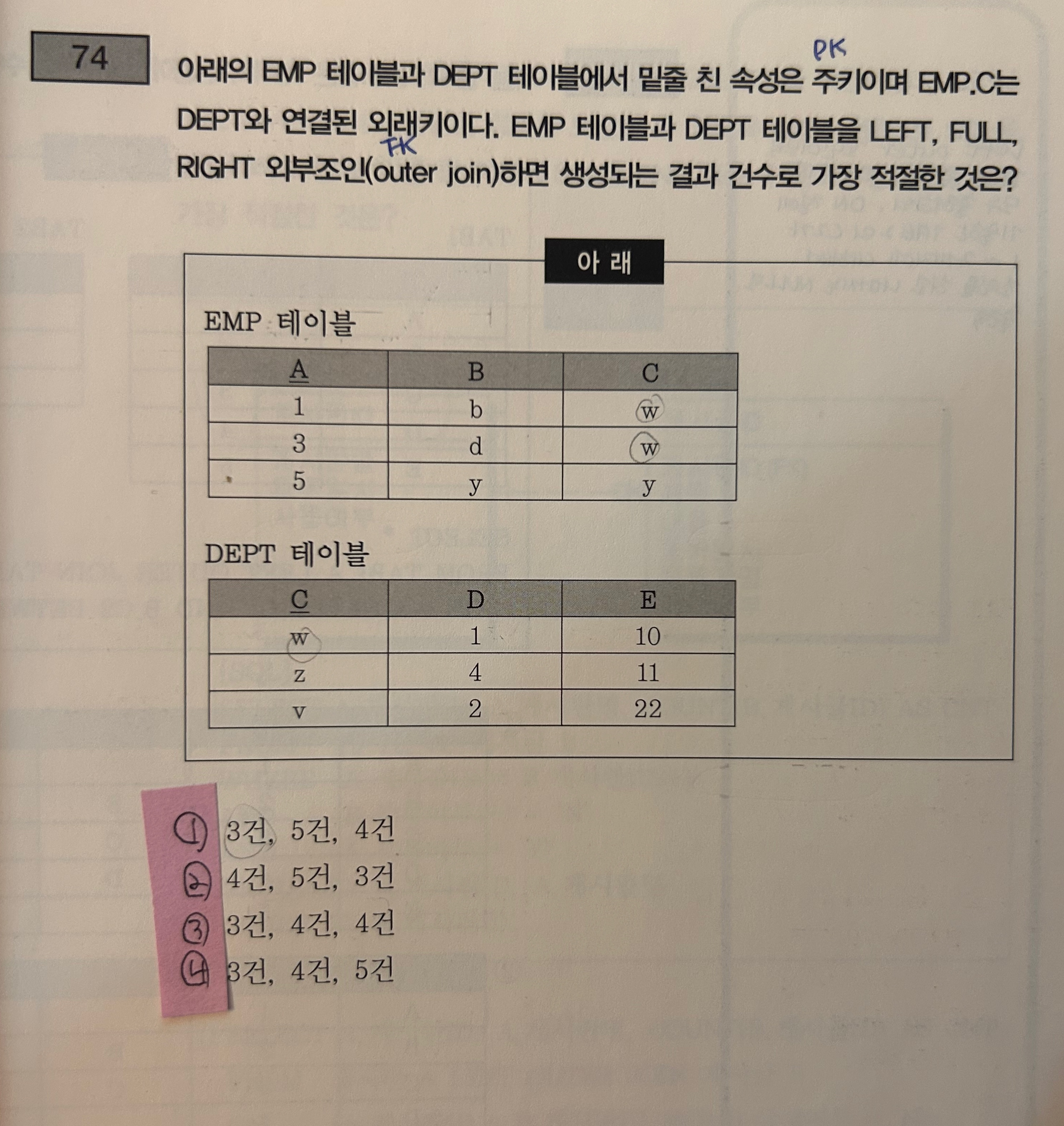 아래의 EMP 테이블과 DEPT 테이블에서 밑줄 친 속성은 주키이며