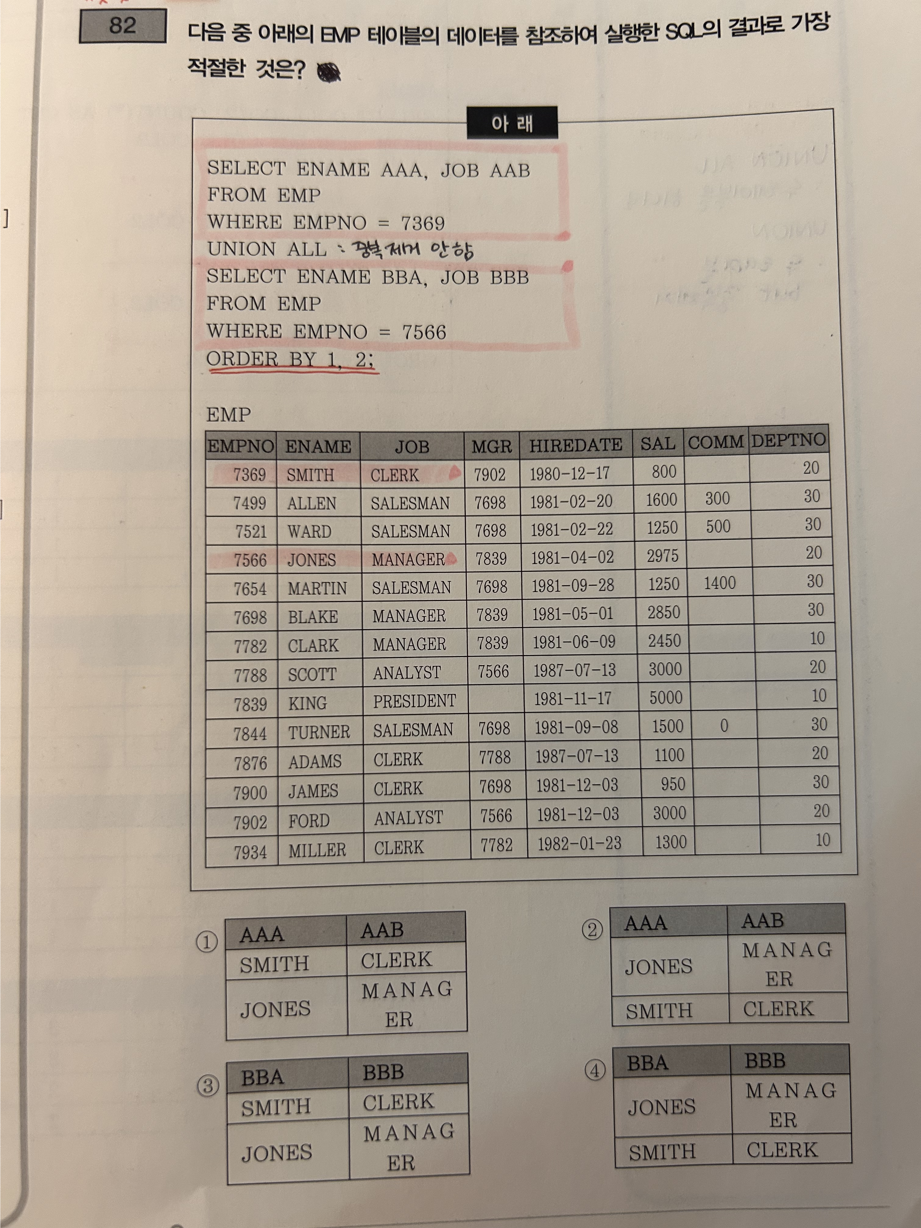다음 중 수행된 SQL과 동일한 결과를 도출하는 SQL은?