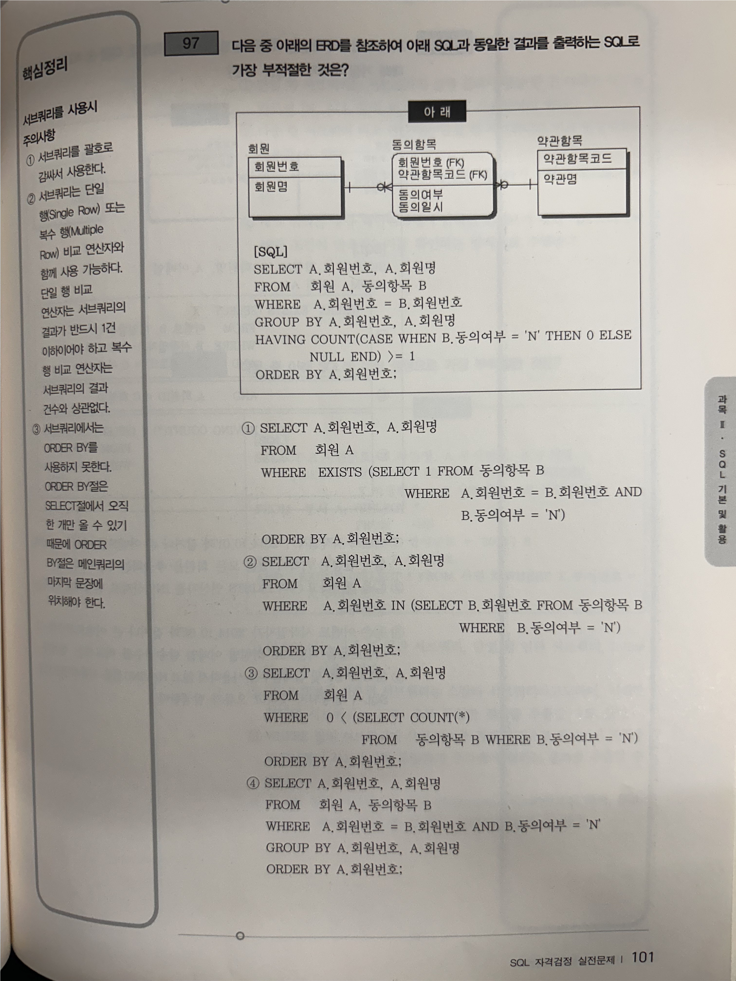 문제 97. 다음중 아래의 ERD를 참조하여 아래 SQL과 동일한 결과를 출력하는 SQL로 가장 부적절한 것은?