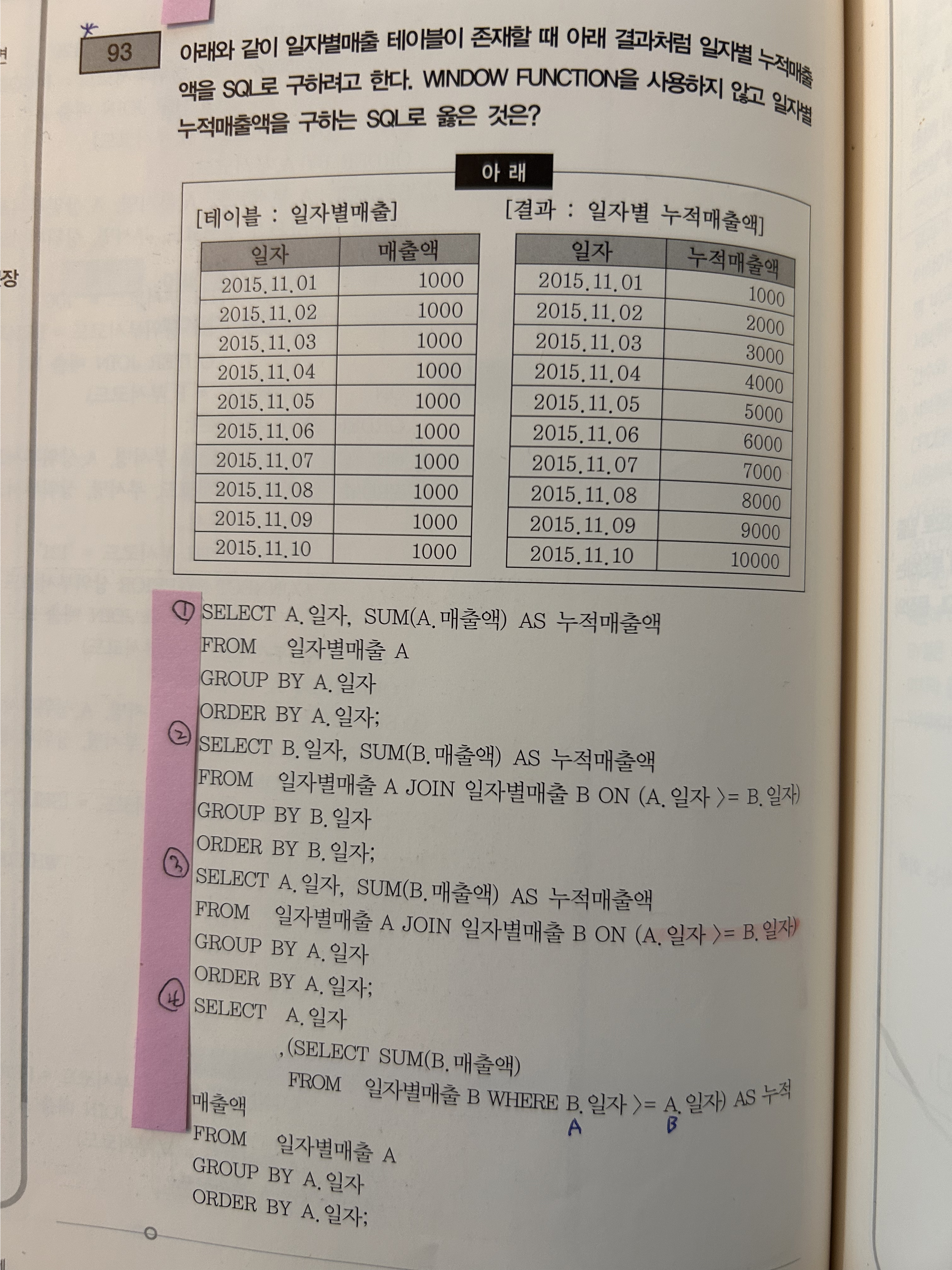 WINDOW FUNCTION을 사용하지 않고 일자별 누적매출액을 구하는 SQL로 옳은 것은?