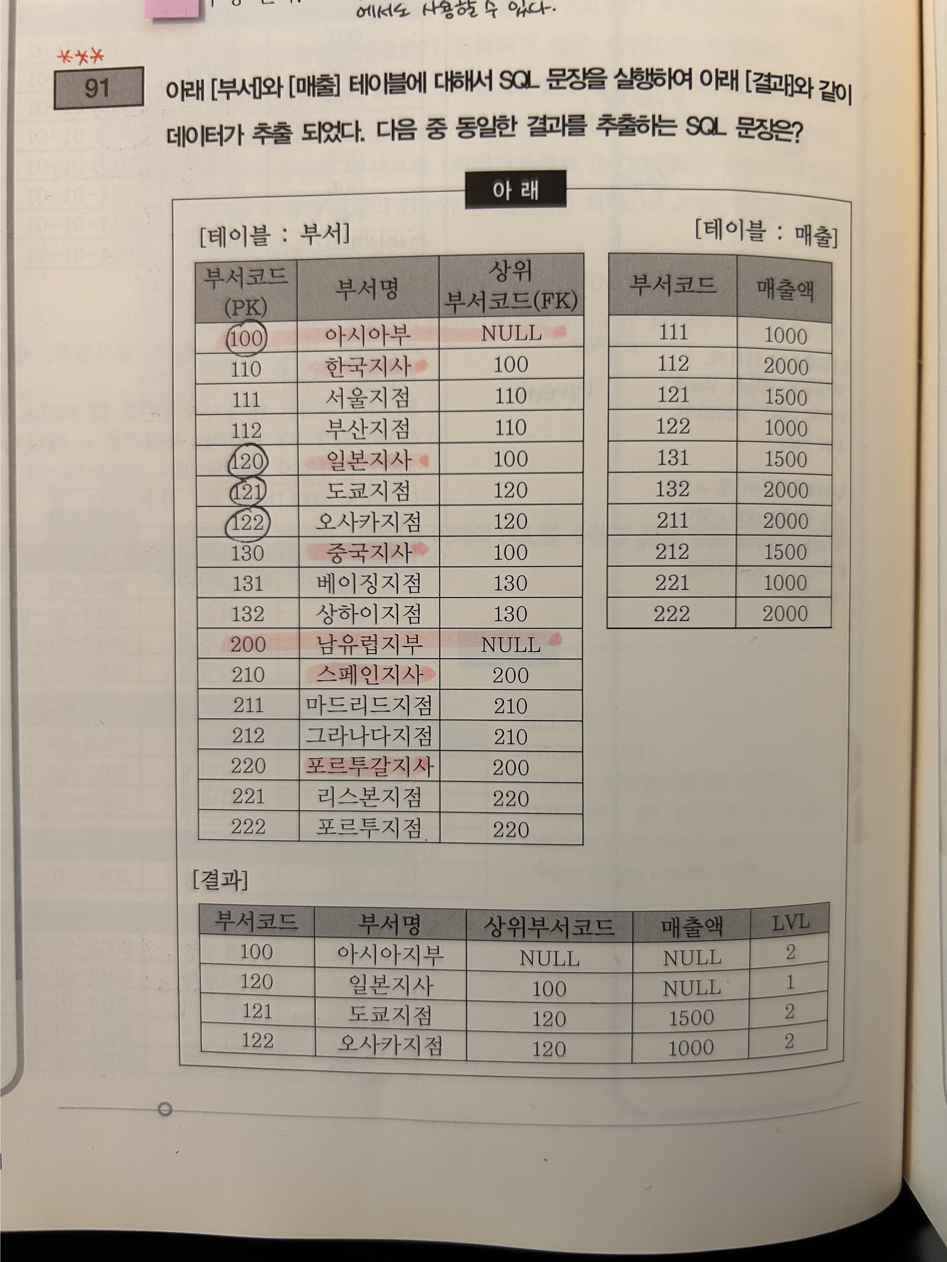 문제91. 아래 [부서]와 [매출] 테이블에 대해서 SQL 문장을 실행하여 아래 [결과]와 같이 데이터가 추출되었다