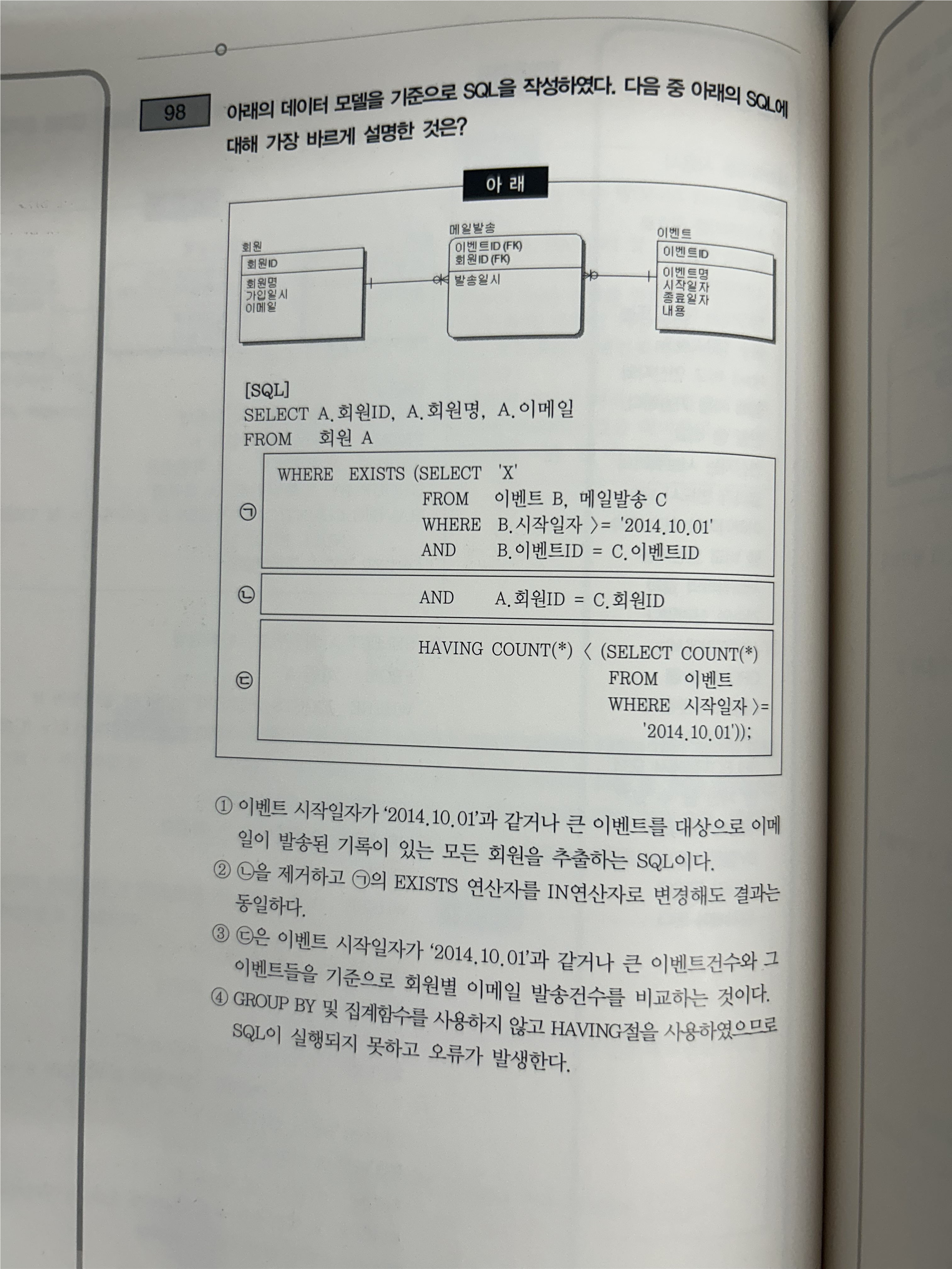 문제 98. 아래의 데이터 모델을 기준으로 SQL을 작성하였다