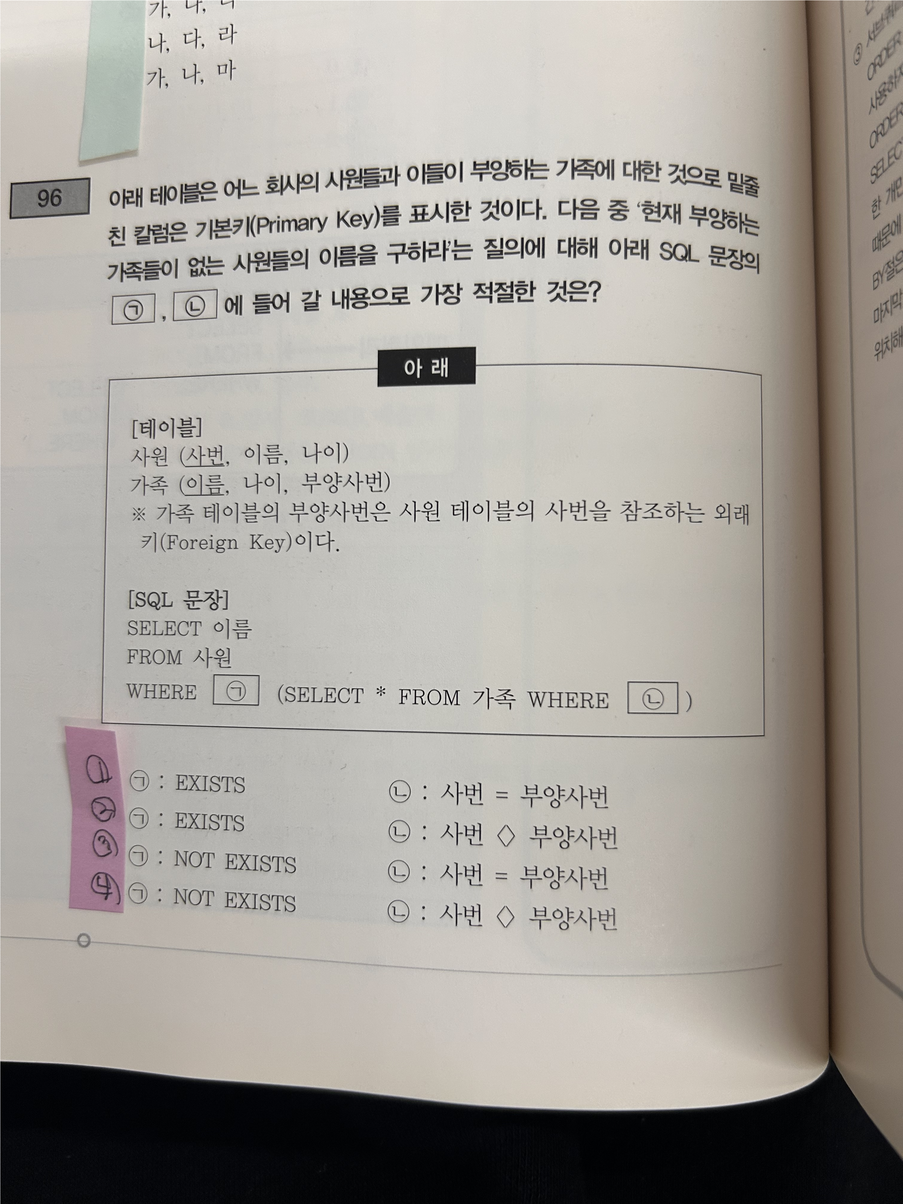 문제 96. 아래 테이블은 어느 회사의 사원들과 이들이 부양하는 가족에 대한 것으로 밑줄친 컬럼은 기본키(Primary Key)를 표시한 것이다. 다음중 현재 부양하는 가족들이 없는 사원들의 이름을 구하라는 질의에 대한 아래 SQL 문장의 (ㄱ) (ㄴ)에 들어갈 내용으로 가장 적절한 것은?