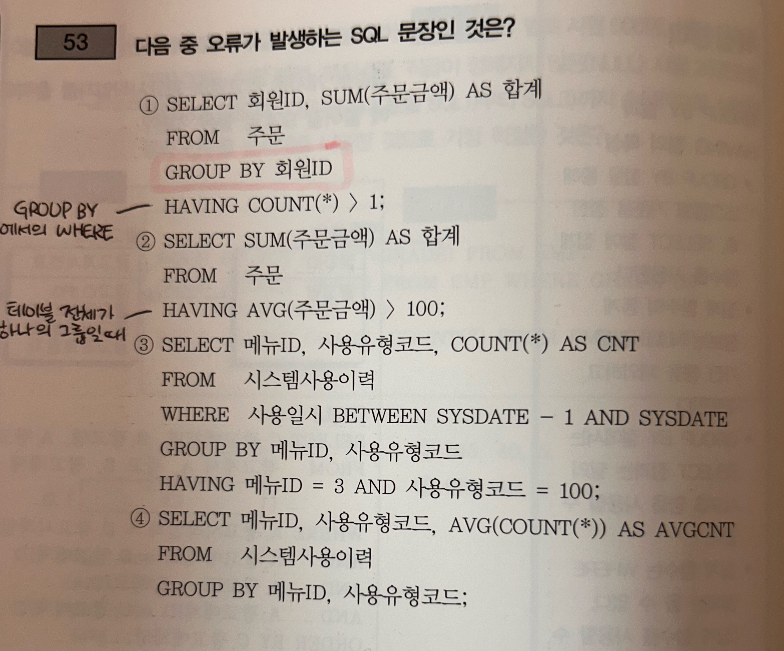 ✅ 오류 나는 건 ④번 (집계함수 중첩 때문)